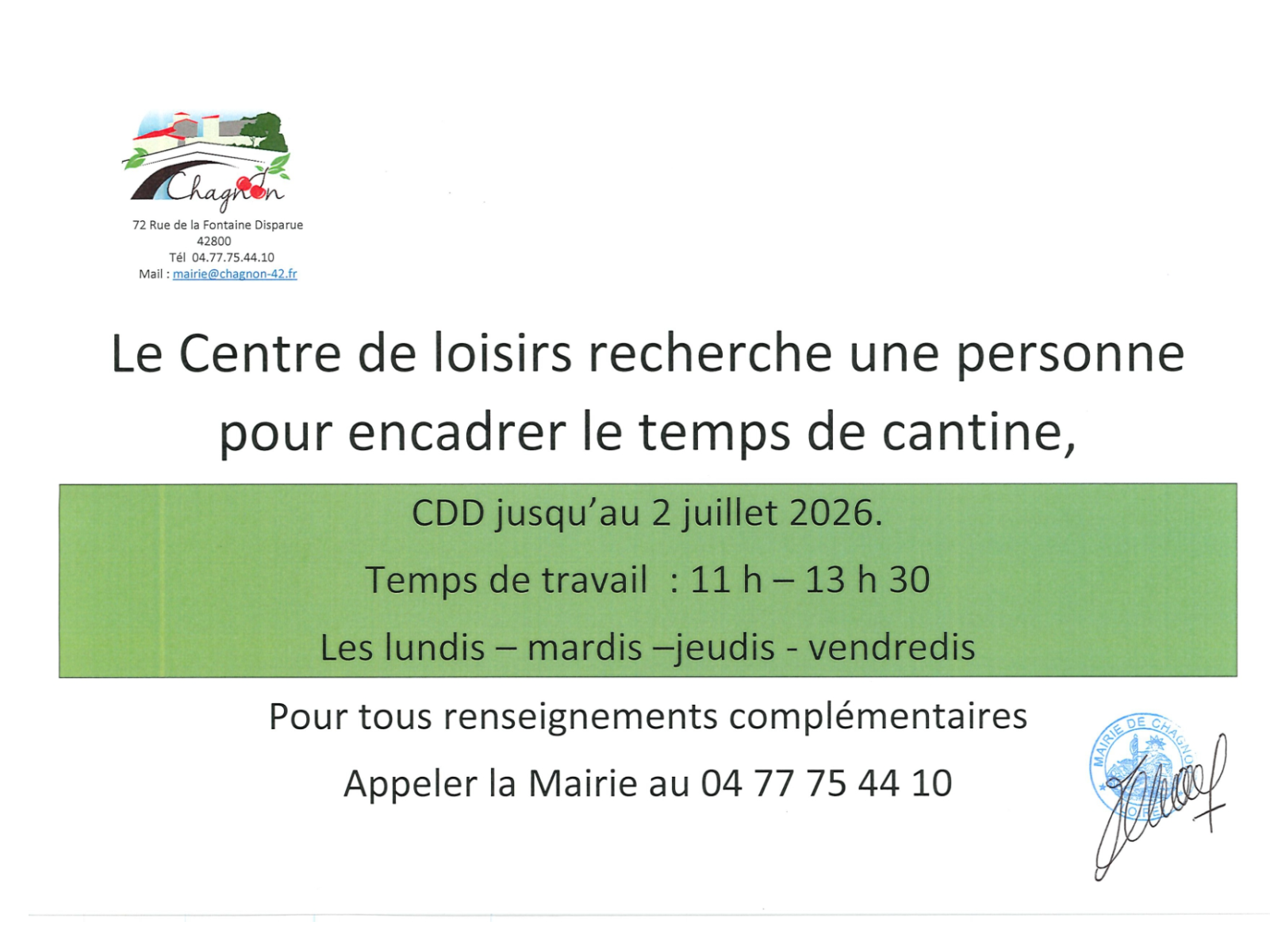 Offre d'Emploi temps horaire Restauration Communale CHAGNON
